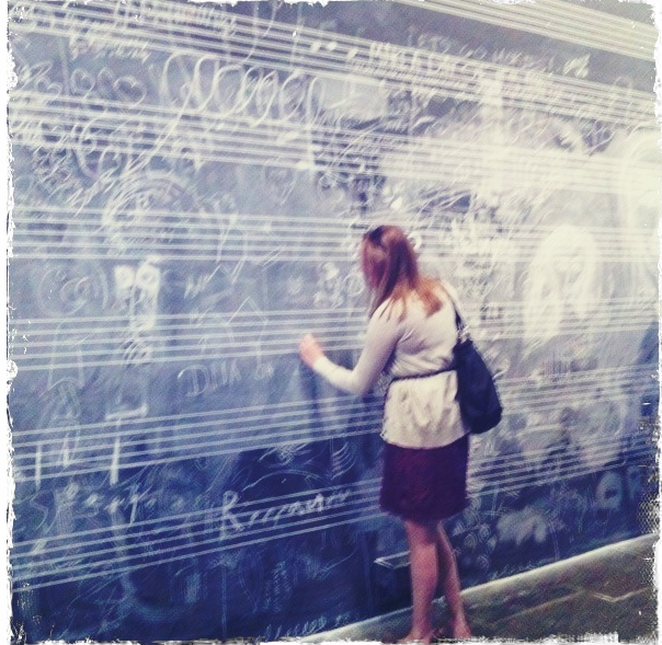 The exhibition relies on audience participation. The weekends feature performances by musicians who have worked with, or are inspired by, Marclay and the audience is encouraged to photograph and record the performances and then upload these to the Whitney Flickr photostream. Along one wall of the space is a giant chalkboard with musical staffs lines. Visitors are asked to create something along this wall, which will later be interpreted by musicians who come in and create a musical piece based on the drawings/writings. This is the first time I have seen a major museum or gallery utilize social media and audience participation effectively. I was basically taking notes all weekend.