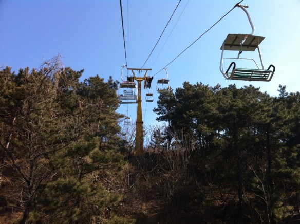 Now, before heading up I was informed that we would ride a gondola up and a toboggan down. I was already a little apprehensive about the toboggan part of the whole scenario as 1) I assume you need snow in order to use a toboggan and 2) the idea of speeding down a mountain scares the daylights out of me. When someone says gondola, what comes to mind? If you are me it’s either the gondolas of Venice (Beijing is clearly not a floating city so that rules out the boat kind) or a cable car, much like the ones we rode up when we visited Mt. Pilates in Switzerland, what does not come to mind is a ski lift up a mountain side.