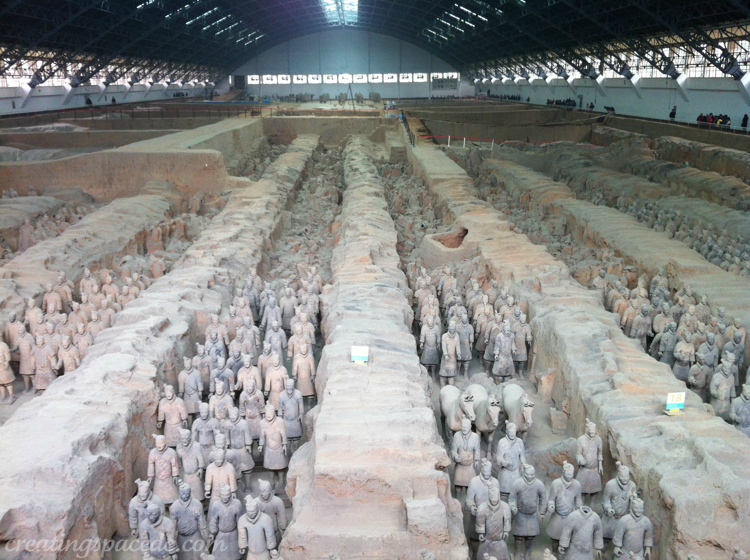 When we arrived at the Terra-Cotta’s the parking lot was already pretty full with buses and tourists. even at 11:30 in the morning there were a lot of people ready to see those warriors. After a brief introduction about how the warriors were first found ( a local farmer was digging for a well and boom ancient statues, isn’t that always the way it is) we made our way into the first pit. What I found most interesting was that there were no written records regarding the warriors in Chinese history. There was no prior knowledge of their existence and no information on why they were created. It was something completely knew and unknown. So exciting. Another thing that really struck me was that the pits are living excavation sites. There are shelves lining sections of the pit, statues and pieces are tagged and numbered as they are still being unearthed and pieced back together. That’s another thing. The story goes that 200 years after the Warriors were made and the Emperor buried, the people revolted and stormed the tomb for the bronze weapons the soldiers were holding. Every single bronze item was removed at that time, and then the wooden thatched roofs that protected the warriors were burned down. Not a single statue remained intact in Pit #1 (there are 3). Those long lines of statues you see in the images, those have all been pieced together like a jigsaw puzzle. Each statue has been reassembled so that there are no mistakes regarding rank and station. Can you imagine finding a million tiny pieces and having to put them back together, making sure that the pieces you are using were actually part of the statue to begin with. And then to realize that every statue is unique, whether because of facial structure, military rank, or even expression. Apparently some of the warriors are happy to be going to war, and others are sad to be leaving their homes. I mean what?! just amazing craftsmanship.